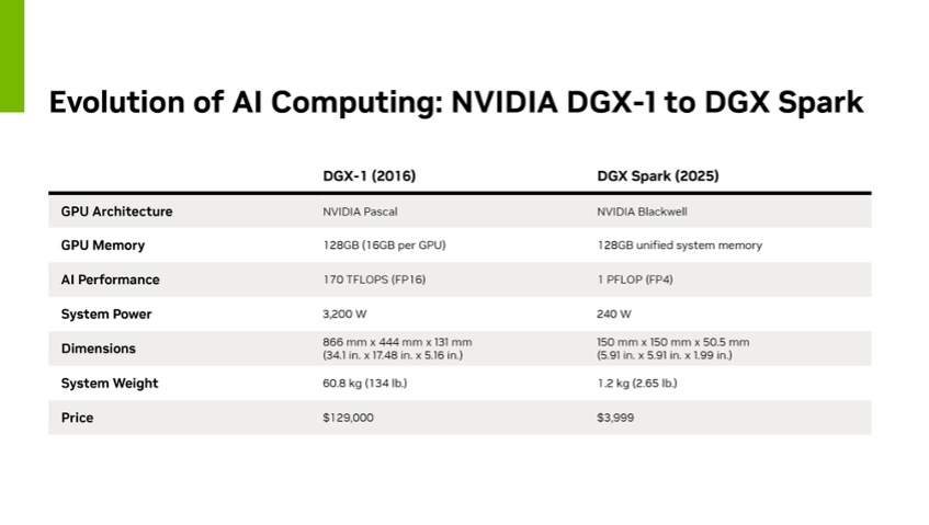 But “scaled-down” only makes sense when you compare Spark to today’s rack-scale DGX platforms. Compared to the original DGX-1, the system that helped define modern AI infrastructure, Spark is smaller, quieter, and dramatically more accessible, while delivering performance and memory characteristics that would have seemed ambitious less than a decade ago.